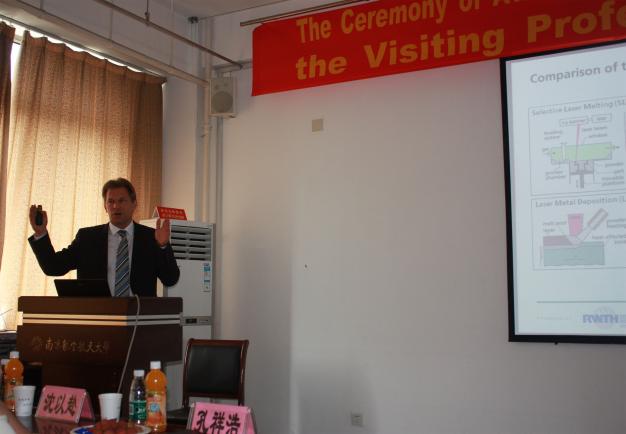聘任仪式上,陈夏初副校长对Ingomar Kelbassa教授加入南航大家庭表示热烈欢迎,向参会嘉宾及我校师生介绍了Kelbassa教授的学术经历和学术成就,感谢了Kelbassa教授过去在激光加工领域对我校的帮助与指导。他表示Kelbassa教授受聘我校客座教授后,有助于学校师资队伍的丰富,有助于南航国际化办学水平的提升,并且期望两校能以此为契机进一步拓宽科研合作领域,加强国际学术交流,联合培养优秀人才,最终提升我校相关学科的国际术影响力。