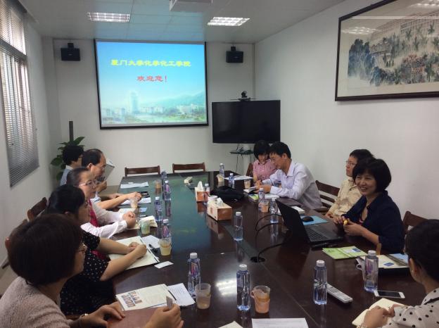 会上,朱亚先教授和梁文萍教授分别从院史发展、教育教学、科学研究、人才队伍等方面介绍了各自的发展现状。梁文萍表明此次赴厦大学习考察的目的是希望厦门大学不吝赐教,给予支持和帮助。双方与会人员围绕“2+2”本科生国际联合培养、双语教学、综合实验课程、化学药品的使用、实验室通风、环保安全等方面及管理使用等方面进行深入交流,并探讨新老教师交接班等问题。