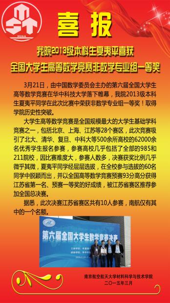 大学生高等数学竞赛是全国规模最大的大学生基础学科竞赛之一,包括北京、上海、江苏等28个赛区,此次竞赛吸引了北大、清华、复旦、中科大等500余所高校的62000余名优秀学生报名参赛,参赛高校几乎包括了全部的985和211院校,因比赛难度大,参赛人数多,决赛获奖比例几乎微乎其微,夏夷平同学经层层选拔,在全校参与选拔的60名同学中脱颖而出,并以全国高等数学竞赛预赛93分高分获得江苏省第一名、预赛一等奖的好成绩,被江苏省赛区推荐参加全国总决赛。