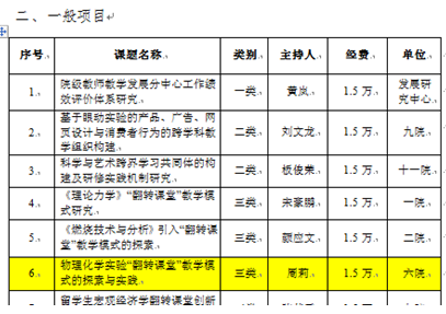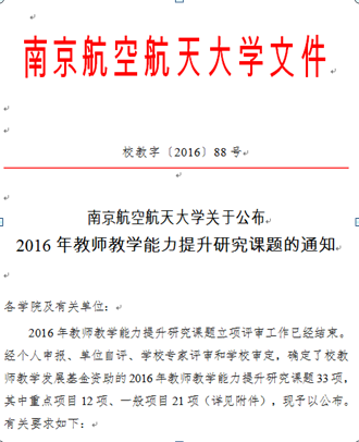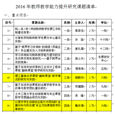 日前,根据学校发布的《关于公布2016年教师教学能力提升研究课题的通知》(校教字〔2016〕88号),确定了校教师教学发展基金资助的2016年教师教学能力提升研究课题33项,其中成人视频 共3项,成人视频 推荐申报的项目全部立项。胡晓丹老师的《理工基础化学课程“翻转课堂”教学模式的研究与实践》、魏东博老师的《以提升学生创新创业能力为导向的“金属材料与热处理”专业方向课程教学改革研究》确定为重点项目,周莉老师的《物理化学实验“翻转课堂”教学模式的探索与实践》确定为一般项目。