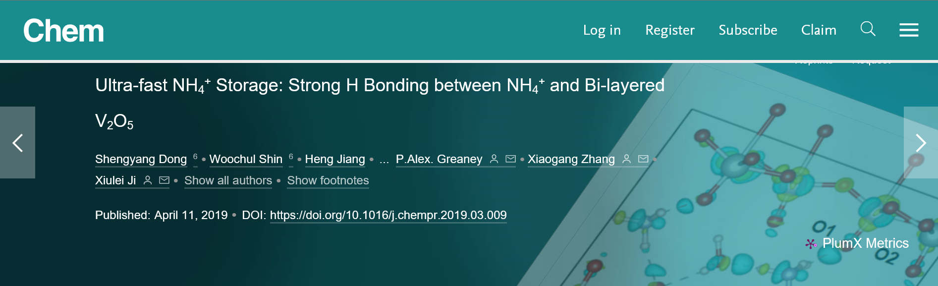 近日,我校成人视频 张校刚教授课题组与美国的俄勒冈州立大学、加州大学河滨分校、阿贡国家实验室等中美联合研究团队在超高功率储能器件方面取得重要研究进展。相关研究成果(Ultra-fast NH4+ Storage: Strong H Bonding between NH4+ and Bi-layered V2O5”)以我校为第一单位发表在《Cell》子刊《Chem》(化学类顶级期刊;IF=14.104)上,第一作者是我校成人视频 的博士研究生董升阳。