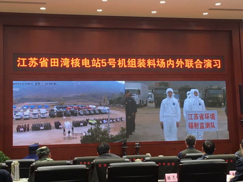 2019年11月8日,江苏省田湾核电站5号机组装料场内外联合演习(代号TW-2019)在江苏省南京市和连云港市同步举行。国家核应急评估团以及全国19个省(市、区)核应急机构和相关涉核组织的专家领导现场评估本次演习。