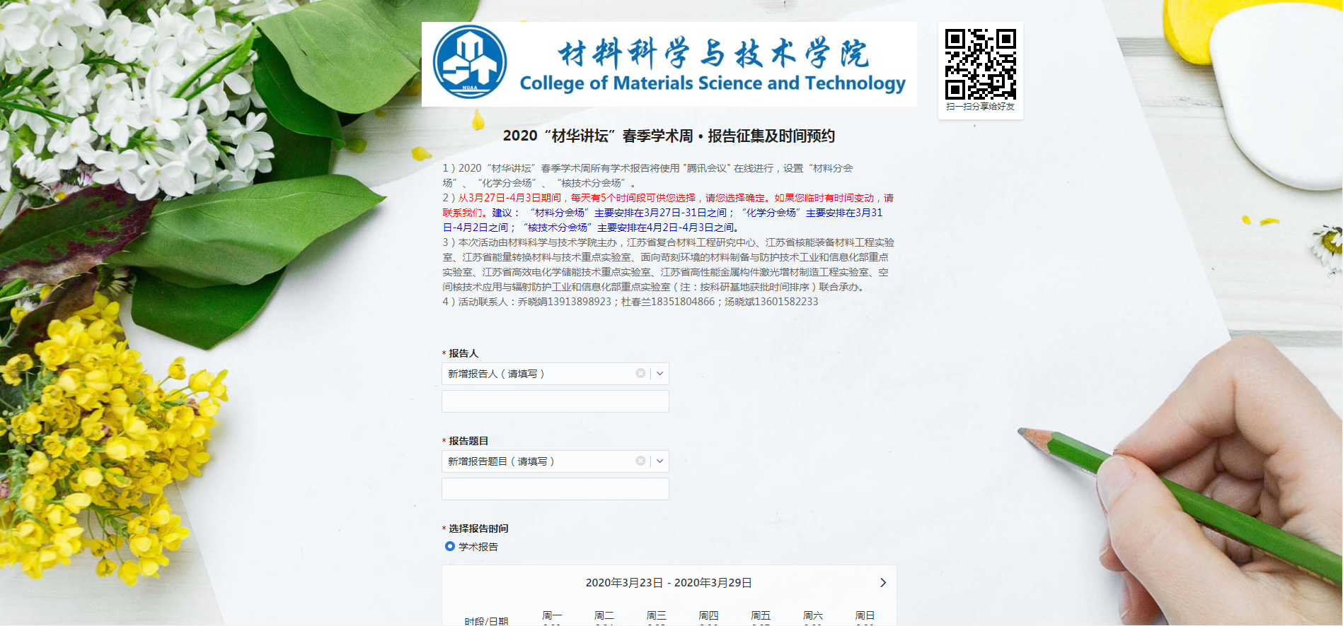 2020年3月27日—4月3日,成人视频 通过网络在线方式举办了2020“材华讲坛”春季学术报告周活动。由于新冠肺炎疫情影响,我校至今仍无法开学,广大学生也无法到校正常学习。材料学院贯彻落实“停课不停学”的学校要求,决定在此期间采用网络会议形式举办2020“材华讲坛”春季学术报告周活动,以期达到宣传南航材料学院、加强学术科研交流、推动本科生专业培养、开展研究生招生宣传等目的。