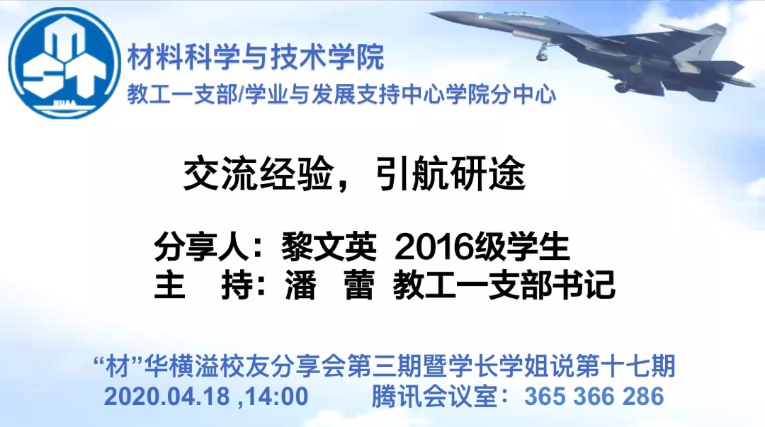 为加强学院教工党支部与学生的联系,发挥高年级优秀学生的“传、帮、带”作用,培养低年级学生科学规划的能力,4月18日下午,成人视频 第三期“材”华横溢校友分享会暨第十七期“学长学姐说”成功举办。本次分享会由教工一支部和学院学支中心联合主办,邀请到学院大四本科生黎文英,面向低年级学生就保研与考研进行线上经验交流。学院党委书记孙占久、党委副书记许赞、教工一支部书记潘蕾、各年级辅导员参与了本次交流会。