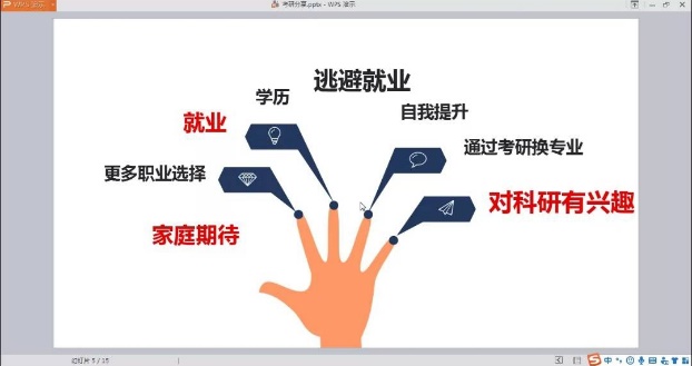 针对保研,黎文英就学院2019年度的保研流程分析了学业成绩与综合排名的关联度,强调了学习成绩的重要性,并嘱咐同学们在疫情期间不放松网课学习;针对考研,黎文英就心态调整和具体规划两方面给出建议,并以制定计划为例,分别从学习初期、巩固、冲刺三个阶段做出了详细的规划指导,启发同学们夯实基础,及时巩固,贵在坚持。
