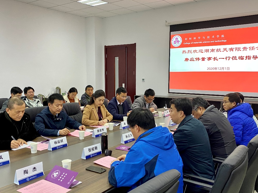 与湖南航天有限责任公司开展对接,围绕双方科研项目合作、人才联合培养、毕业生需求等进行座谈。会议由学院党委书记孙占久主持,湖南航天董事长唐应伟及公司骨干成员、材料学院领导班子成员及相关专业教师参会。