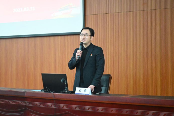 石勇代表学院党委作了党史学习教育动员讲话。讲话中,他也做出了三点希望,一是希望同学们将党史学习与理想信念相结合,立鸿鹄志,崇德求真,在中华民族伟大复兴进程中铸就人生,二是希望同学们将党史学习与专业知识相结合,爱党爱国,明理增信,坚定砥砺奋进的航空报国心,三是希望同学们将党史学习与社会实践相结合,知行合一,力行奋斗,在服务社会发展的实践中建功成才,通过做到这三个希望,不断将“小我”融入到祖国的“大我”中,积极投身中国特色社会主义事业,秉承学校 “航空报国”的办学传统,为国家“三航”事业发展、“两个强国”建设贡献青春力量。